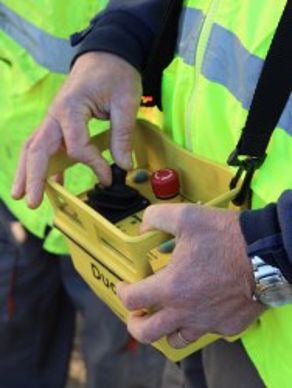 Enfin, un opérateur peut commander les tondeuses à une distance maximale de 300 mètres, à l'aide d'une console portée en ventrière (photo ci-contre).