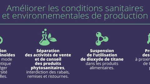 A noter : parmi les mesures de la loi agriculture et alimentation : l'interdiction des néonicotinoïdes et produits à mode d'action identique ; la séparation des activités de vente et de conseil des produits phytosanitaires ; l'interdiction des rabais, remises et ristournes ; ou encore la protection des riverains à proximité des zones de traitement phyto...