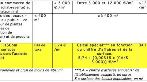 Pour les établissements dont le chiffre d’affaires au m² est inférieur à 2 999 €, le taux de la taxe est de 5,74 € par m² de surfaces comprises dans l’assiette.