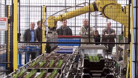 C'est en particulier l'innovante ligne de rempotage, - « où l'on se croirait chez Renault », a résumé un visiteur -, qui a marqué les esprits. De fait, depuis le stockage du terreau jusqu'à la mise en plate-forme, chaque étape est automatisée. Y compris la mise en caisse. « Le robot que vous voyez est un prototype emprunté à l'industrie automobile », a précisé Christian Crépin, soulignant au passage « que Lepage est aujourd'hui la seule entreprise en Europe à travailler ainsi ». Et Guilhem Bost d'ajouter : « Avec l'automatisation, nous gagnons du temps et cela nous permet de développer les commandes spécifiques. » Il a ensuite attiré l'attention des visiteurs sur la gestion de l'eau et plus précisément des eaux de surface : couplé à l'utilisation de bétons poreux, un jeu de pente permet leur récupération. Cette pratique permet à l'établissement d'économiser 30 % d'eau.