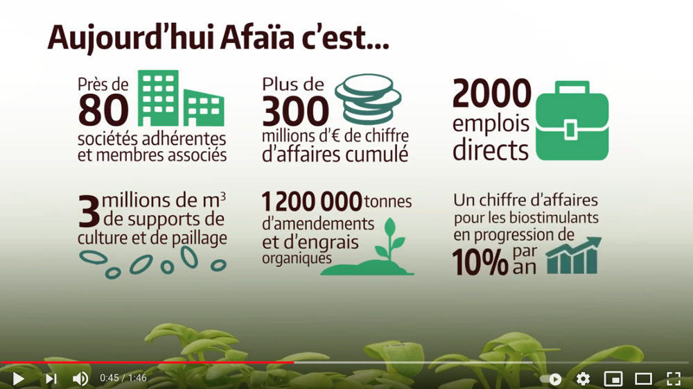 Cette vidéo de promotion réalisée par AFAIA, qui représente pour la France des « entreprises fournissant les matières fertilisantes et intrants innovants des cultures végétales durables » présente les actions de ce syndicat professionnel, de l’organisation de journées techniques à la représentation de ses quelque 80 adhérents, en particulier sur les salons.