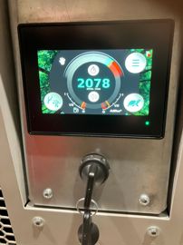 Sur le côté droit du broyeur, un écran de contrôle à Led informe l'opérateur du fonctionnement de la machine en temps réel et centralise les données relatives au système No Stress et au moteur. Le BV N.90 se distingue par la possibilité de tourner la goulotte d’éjection à 360° et par le réglage aisé de l’angle de sa casquette d’éjection, à l'aide d'une poignée crantée, pour envoyer le broyat sur une zone précise. L'opérateur peut ainsi se placer en toute sécurité sur la chaussée. Ce broyeur existe aussi dans une version sur remorque agraire avec un entraînement par prise de force (1 000 tr/min). Il était exposé lors du salon dans cette configuration, avec essieu freiné (poids total : 2,73 t).