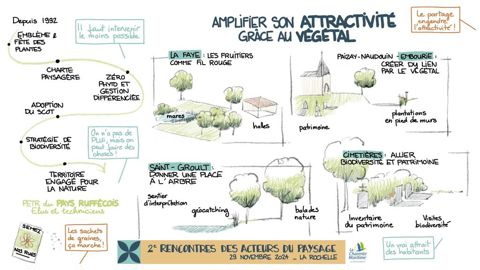 La matinée a fait l’objet d’une animation avec Jordane Ancelin, paysagiste et facilitatrice graphique. Cette approche regroupe un ensemble de techniques visuelles pour améliorer la compréhension d’un projet, d’une démarche, d’une conférence, en direct et par le dessin (voir un exemple ci-dessus).