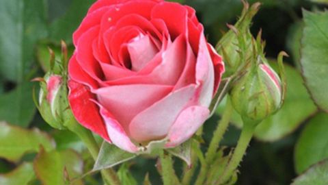 Rosier buisson (certifié ADR) rouge sang à revers blanc crème, il reste compact (60 cm).