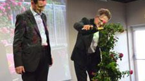 Vingt ans après le lancement d'Emera, Décorosiers dévoile une nouvelle variété : Emera grimpant. Francis Ginestet, parrain du rosier, l'a baptisé lors du salon du végétal.