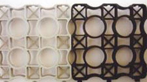 Dalles en polyéthylène recyclable. Leur « plus » est la présence de pics sur le dessous pour l'accrochage au sol.