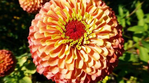 Ce Zinnia offre, sur une même fleur double, une palette chatoyante et unique de tons orange clair et vert lime, liés par des dégradés de jaune.