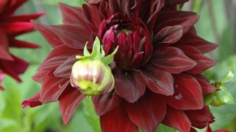 Original, ce dahlia de type « grand cactus dentelle » donne de larges fleurs au coloris rouge bordeaux très foncé.