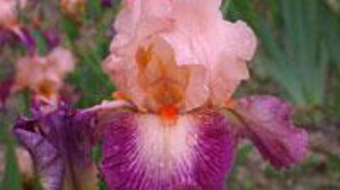 Cet iris propose une association gaie de coloris : des pétales rose pur associés à des sépales rose pâle à large bordure pourpre rosé moyen veiné de rose clair, le tout orné de barbes rouge corail.