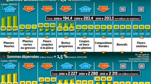 En 2010, les achats des particuliers en végétaux d'intérieur se sont élevés à 203,5 millions d'unités, pour un montant de 2,32 milliards d'euros, soit une stabilité en volume (+ 0,1 %) et une très lég (...)