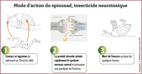 Essentiellement larvicide, ce produit à large spectre est un neurotoxique. Une fois absorbé par l’insecte, il atteint rapidement le système nerveux central (action sur les récepteurs nicotiniques de l'acétylcholine) et provoque une paralysie (blocage du canal chlore du récepteur GABA) qui l’empêche de s’alimenter. Les premiers symptômes apparaissent dans les minutes qui suivent l’ingestion. Ils se traduisent par des tremblements, une incoordination, une paralysie, puis la mort au bout de quelques heures. Son mode d’action est différent de celui des produits de la famille chimique des néonicotinoïdes, interdits en Europe depuis 2018. Efficace par contact et surtout par ingestion, le spinosad n’est pas systémique, mais doté de propriétés translaminaires, c’est-à-dire qu’il pénètre dans les tissus végétaux et migre à travers plusieurs couches de cellules. Il est ainsi mis rapidement à l’abri du lessivage par la pluie ou l’irrigation par aspersion. Il se montre très efficace contre des insectes piqueurs-suceurs de cellules végétales comme les thrips.