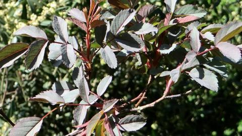 Le rosier glauque est un arbuste montagnard, rustique, au rare feuillage bleuté lavé de pourpre.
