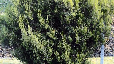 Pied d'une dizaine d'années, en forme libre, dans un massif d'arbustes.