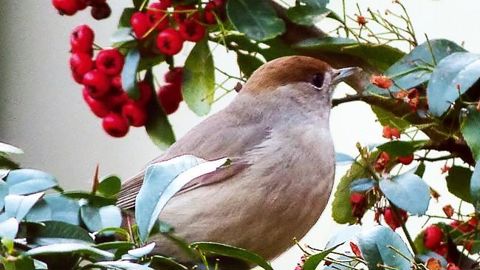 Une couleur attrayante Femelle de fauvette à tête noire attirée par la couleur des baies du Pyracantha. PHOTO : ROYAL SOCIETY FOR THE PROTECTION OF BIRDS