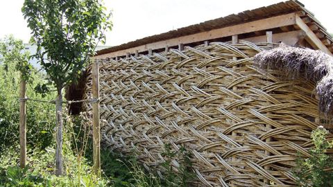 Clôture réalisée selon la technique de tressage dite « roumaine », dans le verger rucher de Veneux-les-Sablons (77). PHOTO : JOËL CHATAIN