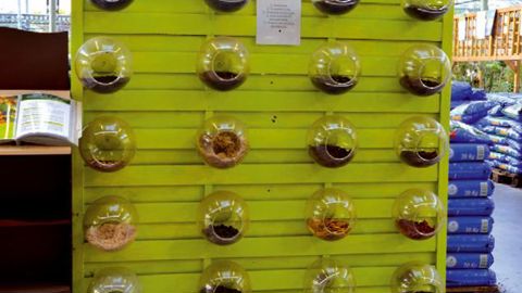 La démarche « Jardiner au naturel » s'applique aussi au sein du rayon des vivaces, de la pépinière, des équipements... Au détour du rayon paillage, on aperçoit une structure imposante. Le consommateur peut toucher une vingtaine de paillis. « C'est un support théâtral pour accompagner le client. Il y a un gros travail à effectuer pour montrer qu'il existe d'autres paillages que l'écorce de pin », explique le chef du rayon.