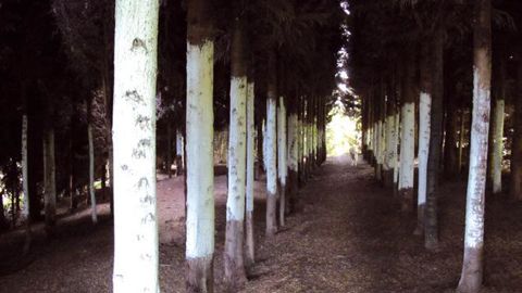 EsthétiqueDans ce « Bois des ombres », la bande blanche peinte sur les troncs des arbres accentue l'effet de profondeur.