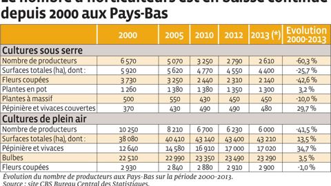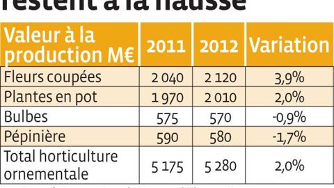 Si la filière des fleurs coupées est en difficulté depuis de nombreuses années, sous la pression des importations d'Afrique de l'Est, les producteurs de plantes en pot et de pépinière s'en sortaient mieux. L'ensemble du secteur a commencé à rencontrer des difficultés en 2009. Même avec un léger mieux en 2012, la situation reste tendue. La morosité de la plupart des marchés d'Europe de l'Ouest pèse sur les prix, alors que les coûts du capital (foncier et investissements), de la main-d'oeuvre et de l'énergie ne cessent de croître. Selon les chiffres du LEI (1) et de la Rabobank (2), la majorité des producteurs dépassent à peine leur seuil de rentabilité et 44 % des établissements seraient dans le rouge. En 2012, 200 établissements de culture ornementale sous serre ont fermé leurs portes. Depuis 2010, le nombre de producteurs de plantes en pot et à massif a chuté de 17 % et celui de fleurs coupées de 23 %. En termes de surfaces, les plantes en pot sont en repli depuis 2010 (- 5,8 % en deux ans), alors que les plantes à massif et la pépinière affichent une légère hausse en 2012 et que les bulbes sont stables.