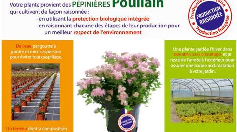 La société Poullain propose aux jardineries un affichage spécifique présentant ses trois nouvelles gammes et expliquant sa démarche environnementale. Engagement dans la PBI (protection biologique intégrée), broyage en remplacement du désherbage dans les zones non cultivées, arrosage piloté par informatique, mini-asperseurs en lieu et place des rampes oscillantes, fertilisation retard... : « Tous ces efforts font partie des valeurs sur lesquelles nous voulons communiquer », souligne Aude Lagadic. Le chef de culture ajoute : « Sur les foires aux plantes, nous nous apercevons que le client final s'intéresse effectivement à ce que nous faisons. » Reste une interrogation sur l'utilisation des labels (la pépinière est Talent d'Île-de-France et Plante Bleue est en cours de développement) et autres mentions (Made in France, etc.) : « Une véritable jungle et un manque de visibilité pour le client de détail ! »