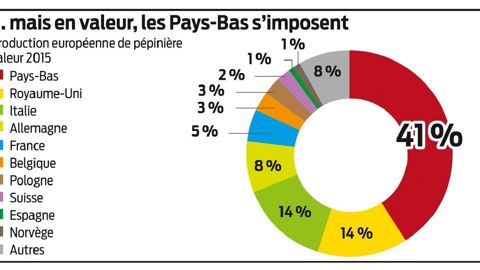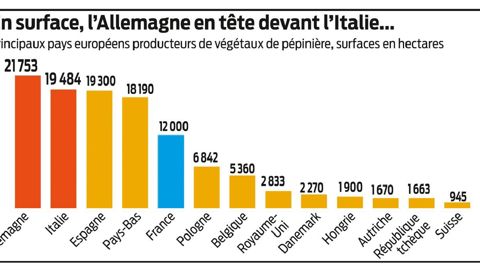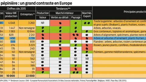 Selon les données collectées par l'AIPH, les surfaces de production européennes ont augmenté de près de 2 % entre 2006 et 2013, notamment à la suite de l'adhésion de nouveaux pays tiers, pour se stabiliser depuis 2014. Dans le même temps, la valeur serait passée de 8 à 10 milliards d'euros grâce à l'intensification des productions. Il y a cependant de grandes différences selon les pays. En termes de tendances, l'Allemagne et la France affichent une réduction de la production et de la consommation de végétaux. Pays-Bas, Italie, Espagne et Royaume-Uni prévoient une légère reprise, ainsi que, pour les trois premiers, un développement de leurs exportations. Les pays d'Europe de l'Est semblent souffrir de la crise et prédisent au mieux un maintien de leur production. La plupart des nations citées entrevoient des perspectives plus favorables pour le secteur du paysage que pour celui de la consommation des ménages, à l'exception notable de l'Allemagne (4) et de la France. Les tensions sur les marchés accroissent la concurrence entre États membres. Elle est exacerbée par les écarts structurels entre grandes pépinières faisant travailler de nombreux sous-traitants et entreprises familiales, ainsi que par les différences de coût du travail, en particulier avec les pays employant de la main-d'oeuvre provenant de l'Est, comme l'Allemagne, les Pays-Bas et la Belgique. Pour la France, le dernier observatoire (5), réalisé par AND pour FranceAgriMer et Val'hor, révèle l'accélération de la diminution du nombre d'entreprises, accompagnée depuis 2012 d'une baisse des surfaces et de la valeur. Au-delà du phénomène de concentration observé dans plusieurs pays européens, il y a érosion du potentiel productif de la pépinière française : entre 2011 et 2015, celle-ci a perdu 2 250 ha et 88 millions d'euros (- 16 %) de valeur. La situation économique pèse sur les sociétés, dont les défaillances observées depuis 3 ans illustrent la fragilité. Les échanges internationaux de végétaux de pépinière sont essentiellement intra-continentaux, pour au moins 3 raisons :
