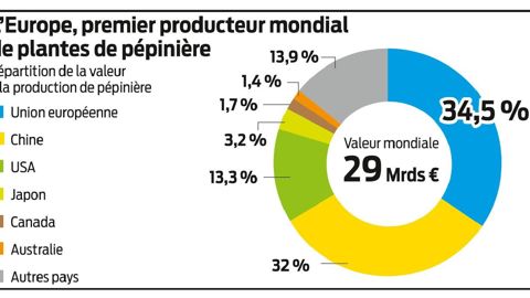 L'AIPH recense plus d'1 million d'hectares de production de végétaux de pépinière dans le monde, dont 70 % en Chine. Il faut cependant relativiser l'importance de la pépinière chinoise, en raison d'une productivité assez faible, ramenant sa part dans la valeur à la production mondiale à 32 %, et d'une production essentiellement destinée au marché intérieur (voir infographie « L'Europe, premier producteur mondial de plantes de pépinière »).