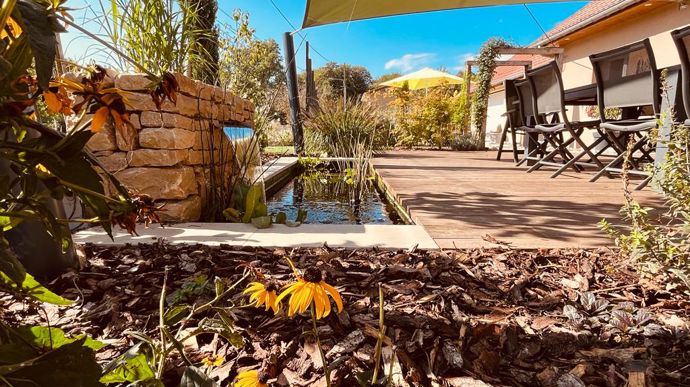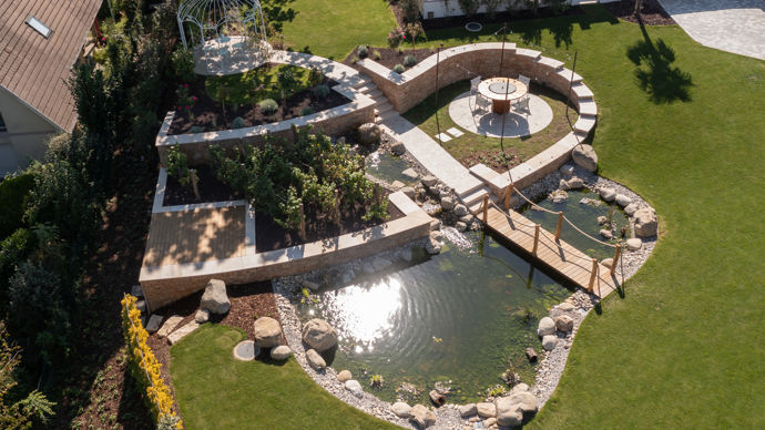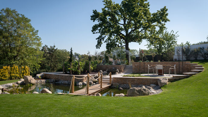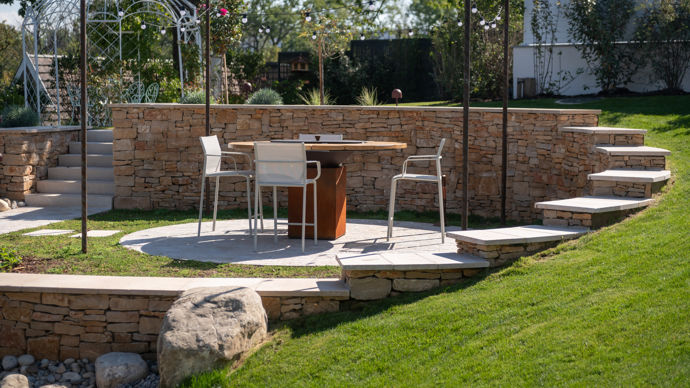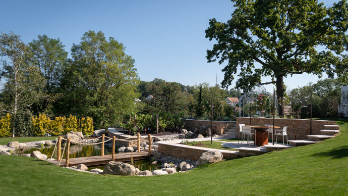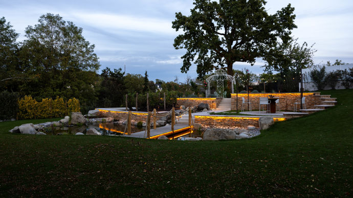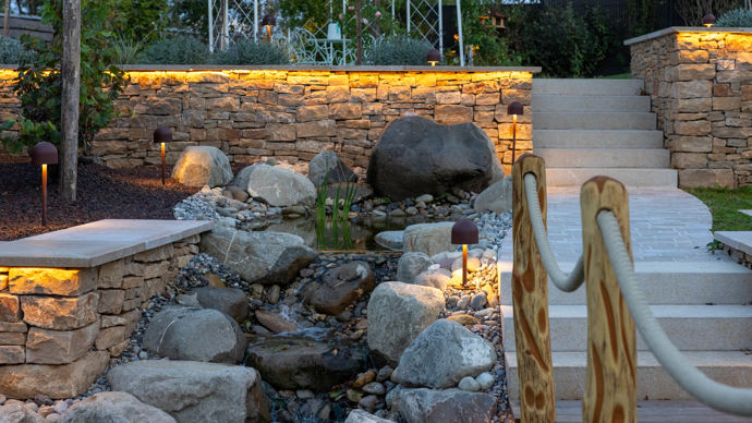 La société alsacienne Muller Paysages a remporté le trophée dans la catégorie « Créativité » pour son projet « Cocon de bien-être », réalisé chez un particulier. Établi sur l’emplacement d’une ancienne maison, ce superbe aménagement technique est conçu sur plusieurs niveaux, délimités par des murs en pierre et reliés par des chemins pavés et des escaliers en pierre naturelle. Ce « Cocon de bien-être » offre plusieurs ambiances, avec son bassin surplombé d’un pont en bois et alimenté par un petit ruisseau artificiel, ses rangs de vigne, son espace convivial avec brasero et sa terrasse élégante avec gloriette enfer forgé. Le tout est sublimé de nuit par des éclairages.
