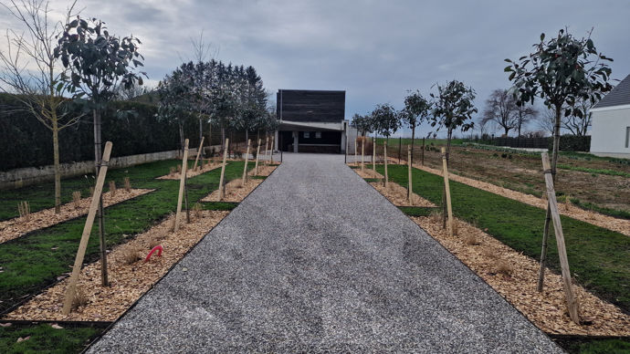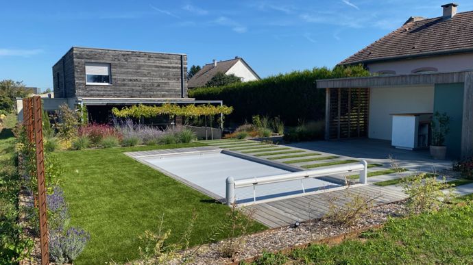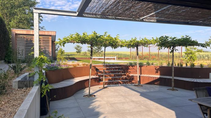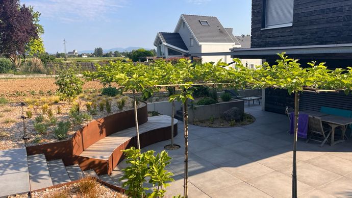 Le prix « Environnement », qui prend en compte la biodiversité, le choix de végétaux adaptés au changement climatique et la gestion de l’eau, a été remis à une autre entreprise alsacienne, L’An Vert du Jardin, pour son travail sur un jardin atypique de 270 m de long pour seulement 14 m de large. Ouvrages drainants et perméables, allées d’arbres, prairie fleurie et terrasse en demi-niveau avec des arbres parasols favorisant l’ombrage ont ici séduit le jury.