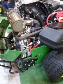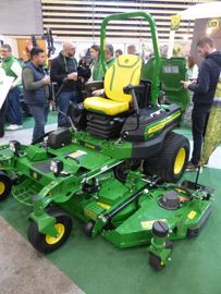 La nouvelle tondeuse automotrice John Deere Z998R est une machine hybride électrique et diesel (moteur de 43,4 ch). Elle offre une largeur de coupe de 2,54 m en éjection arrière. Ses plateaux de coupe latéraux sont entraînés électriquement, de même que leur relevage. La largeur, ailes repliées, est de 1,85 m.