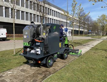 L’unité de désherbage dispose quant à elle d’une chaudière à commande numérique (sans réglages) qui produit un mélange d’eau bouillante et de vapeur chauffée à 140°C, une combinaison qui renforce le choc thermique subit par les indésirables, l'eau chaude attaquant la partie racinaire tandis que la vapeur atteint la partie foliaire. La chaudière au fioul du désherbeur (compatibilité avec des carburants biodégradables de type Aspen), alimentée par une batterie 12 V, bénéficie comme le porteur d’une autonomie de fonctionnement électrique d’à peu près 8 heures et possède un réservoir d’eau de 500 L.