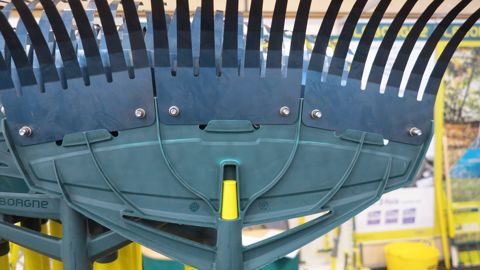 ©Les deux nouveaux balais Leborgne intègrent des dents en acier à ressort de haute résistance montées sur une structure robuste. Les peignes, boulonnés, sont démontables et réparables pour prolonger leur durée de vie. Les dents sont recyclables, et le manche en bois est certifié PEFC. Le petit modèle XR1 de 17 cm de large, avec un seul peigne, est destiné aux finitions dans les zones étroites ou difficiles d’accès comme sous les haies. Le grand modèle XR3 de 55 cm de large est composé de trois peignes dotés chacun de sept dents en métal. Il permet de ramasser rapidement des déchets végétaux volumineux.