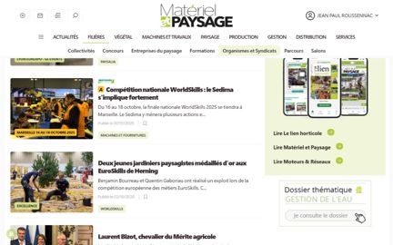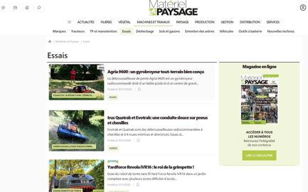 Les publications de Matériel et Paysage (sans logo puisque le site principal est celui de ce titre) sont déclinées principalement dans les rubriques « Actualités », « Filières », « Machines et Travaux », « Paysage ». Vous accédez à une veille technologique, aux essais de machines, aux visites de chantiers ou encore aux informations sur la sécurité. Le titre redevient 100 % « machinisme et chantier » comme à ses débuts, voici 23 ans.