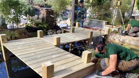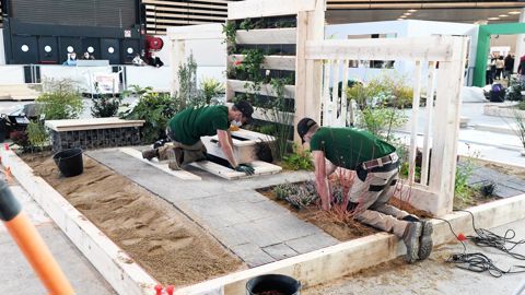 Ils ont dû préparer et utiliser différents matériaux tels que la pierre naturelle, le bois, le sable, différents granulats, du gazon en plaques et des plantes de toutes tailles. Ils ont dû planter, créer un bassin et un mur végétalisé.
