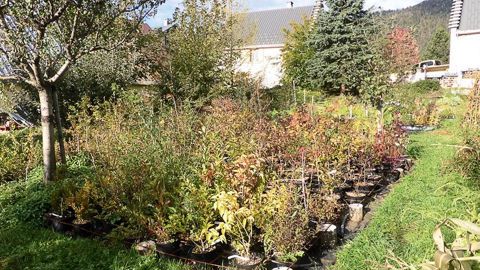 Arrosés au goutte-à-goutte avec l'eau de source, et paillés, les arbustes en pot arrivent bien ramifiés à l'automne. Le site est classé refuge LPO. PHOTO : LORRAINE AGOFROY