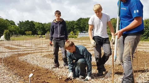 Bertrand Castel, enseignant, et des élèves préparent des massifs de dahlias pour le Festival de septembre. PHOTO : COUTANCES