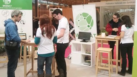 Cette jeune entreprise créée il y a trois ans n'en est pas à son premier salon agricole (Sival, InnovAgri, Terre en fête...), mais c'est la première fois qu'elle participe au Sia. Elle propose des capteurs connectés, très faciles à installer et à utiliser, sans branchement, sans maintenance, autonomes et de longue durée de vie, pour gérer les données météorologiques (température de l'air, hygrométrie, pluviométrie) et agronomiques (température du sol, tensiométrie) dans une exploitation. « Nous avons développé un système de gestion de ce type d'informations en ultra local, en temps réel 24 heures sur 24. C'est intéressant, en particulier pour les parcelles de plein champs éloignées ou les exploitations qui ont beaucoup de sites de culture. Notre solution est économe en énergie ; elle n'a pas besoin de wifi ni de cablage. Elle utilise les ondes radio du système Sigfox qui envoient les informations en longue portée vers une plate-forme. Des alertes peuvent être reçues sur un smartphone. Un historique des données est conservé », a détaillé l'un des créateurs de Weenat. Un accès Internet permet de visualiser sur un smartphone. Le service propose les capteurs et un abonnement annuel. Si elles sont présentes surtout dans le maraîchage, les équipes de Weenat ont déjà une expérience dans l'horticulture... aux Pays-Bas, et estiment pouvoir s'adresser aux agriculteurs du monde entier. Plus d'informations sur le site www.weenat.com.
