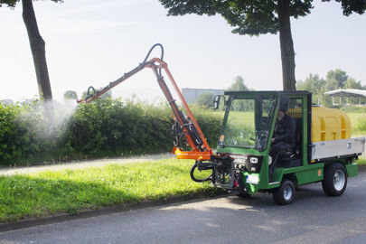 De fait, cet arroseur est capable de contourner divers obstacles en toute sécurité, des voitures stationnées sur un parking par exemple. Cet accessoire, relié à une citerne posée sur le porteur, se pilote dans la cabine avec un boîtier de commande ou bien depuis une radiocommande radio, afin de contrôler les mouvements du bras, actionné par quatre vérins hydrauliques, mais aussi le mouvement de la tête d’arrosage et la largeur du jet.