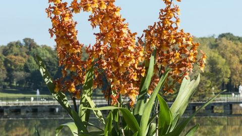 Cette orchidée hybride offre des essaims denses de petites fleurs aux pétales feu, brun orangé, avec des labels jaune orangé, l'ensemble étant spectaculaire. Sa hauteur atteint 90 cm. Elle a été remarquée dans la rubrique « plantes de serre et d'orangerie ».