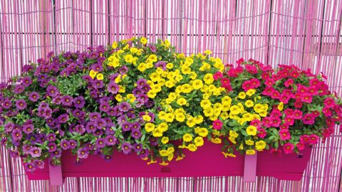Cette nouvelle série est génétiquement compacte mais assez poussante pour l'utilisateur final (30 cm environ, sur un balcon). Elle ne nécessite pas ou très peu de régulateurs de croissance. Elle est disponible en 6 coloris vifs et d'autres couleurs sont annoncées.Comme 'Mille Baci', elle fleurit bien au-dessus du feuillage, et toute la saison. La floraison étant proche entre les coloris (à 5-7 jours près), elle est propice aux combinaisons et compositions mixtes.En photo : 'Gran Mille Baci' Yellow (ci-dessus) et un mélange de bleu/jaune/magenta (ci-dessous).Pour le producteur, elle est annoncée « facile à cultiver, à faible température, rentable concernant la densité, et commercialisable à partir de la semaine 16 ».Pour le client final, elle est annoncée « résistante à la chaleur et à l'humidité ».