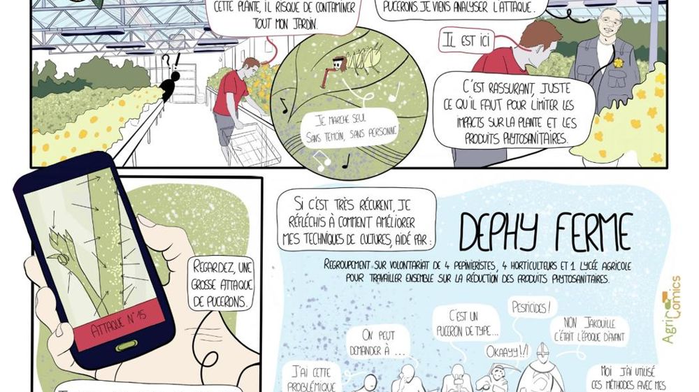 Les Serres de Butry (95) ont confié à Loïse Triollet la création d’une page de BD sur la lutte raisonnée (ci-dessus). À 25 ans, celle qui a créé Agricomics, deuxième au concours AGreen Startup 2021, assure : « Associer image et texte augmente la compréhension et la mémorisation. La BD vulgarise des informations techniques ou scientifiques. »