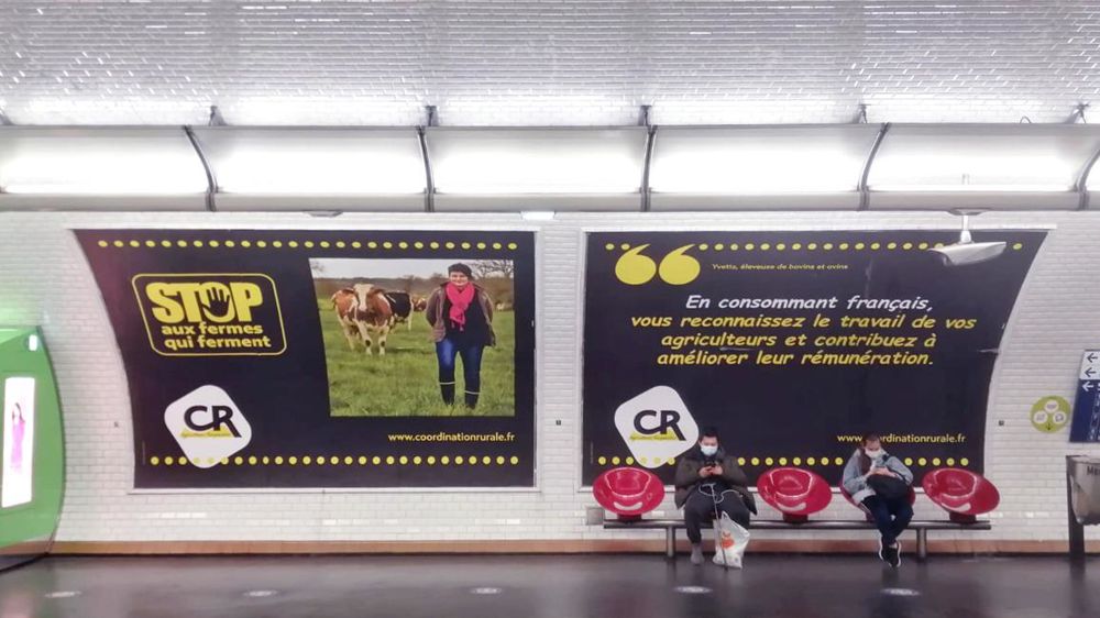 De son côté, la Coordination rurale organisait, jeudi 4 mars à Paris, une manifestation visant à dénoncer le malaise agricole. Son constat : « Environ 1 500 dépôts de bilan par an, deux suicides par jour, des revenus parmi les plus bas de la société, un travail sept jours sur sept sans compter les heures, des dettes qui s’accumulent, une pression sociétale plus forte, un isolement grandissant [...] ». Pendant une semaine, le syndicat a mené une campagne d’affichage dans la capitale, à la station de métro Bastille (notre photo).