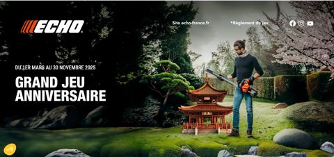 1 000 revendeurs . Un voyage au Japon pour deux personnes est mis en jeu avec une « roue de la chance » : deux voyages seront offerts, et le jeu, ouvert du 1er mars au 30 novembre, autorisera trois lancers de roue. Les consommateurs accèderont aussi à des bons de réduction de 25, 50 et 100 € à valoir sur l'achat de produits Echo (remise différée dans les points de vente Echo participants ; opération ouverte jusqu'au 21 décembre 2025).
