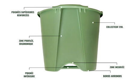 Le GreenCollect a été pensé et conçu par un jardinier paysagiste, pour les jardiniers paysagistes ! Ce conteneur de 120 L, haut de 58 cm, large de 50 à 66 cm de sa base à sa hauteur, est parfaitement adapté aux tontes, petites branches, feuilles et tailles d'arbustes.