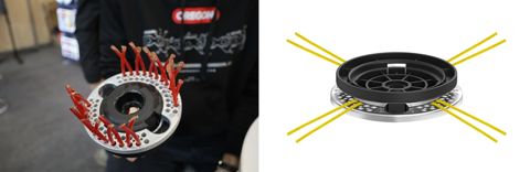Ces brins s’installent ou se retirent très facilement afin d’être remplacés par des fils plus fins (jusqu’à 8 brins) et courbés, qui vont tourner à la manière d’une tête de débroussaillage classique (voir photo). Un QR code sur le paquet du produit permet à l’acheteur de vérifier la compatibilité avec sa machine, sachant que différents adaptateurs sont inclus.