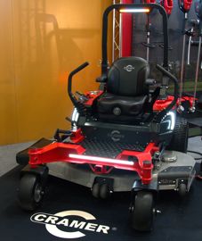 Cramer présentait également à Paysalia la deuxième génération de sa tondeuse zero-turn Optimus Z, qui adopte des améliorations bien vues : signature lumineuse tout autour de la machine pour une visibilité renforcée; nouveau châssis avec renforts mécano-soudés, notamment sur les supports de roues avant ; batterie sous le siège conducteur pour réduire le porte-à-faux arrière ; plateau de coupe avec moteurs dans le carter (et non au-dessus) pour améliorer leur refroidissement ; capteur électronique d’effort sur les lames ; moteurs de roues intégrés aux moyeux pour une meilleure traction et une fonction antipatinage, ou encore tableau de bord à écran tactile et digital (gestion de l’avancement et du régime de rotation des lames).