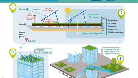 Le 1er dossier aboutira à un modèle des échanges thermiques entre le panneau et la toiture végétalisée, ainsi qu’à un modèle du transfert thermique dans le panneau et de son impact sur le rendement.
