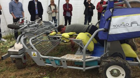 La société Touti Terre a présenté son robot collaboratif enjambeur pour le maraîchage. L’utilisateur plante, désherbe et récolte dans sa serre ou son champ allongé sur la machine qui avance à vitesse régulière (voir photo ci-dessous). La position de travail permet de diminuer la pénibilité et d’augmenter la productivité. Toutilo est utilisé par 45 personnes (en France, aux Pays-Bas et au Canada).