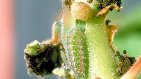 Les dégâts sont provoqués par la larve, qui pénètre dans les boutons floraux qu’elle dévore. Elle mesure 9 mm, est poilue, jaunâtre, avec 2 bandes longitudinales roses (mimétisme avec les boutons floraux).