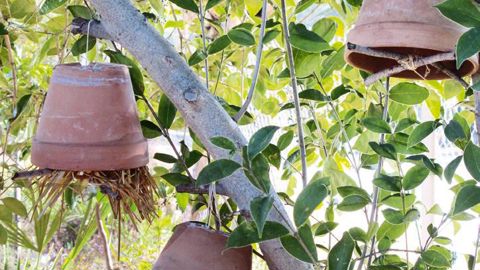 Abris – pots en terre cuite – à perce-oreilles suspendus dans un arbre (Scradh). PHOTO : VALÉRIE VIDRIL