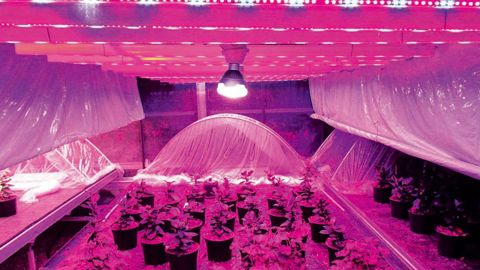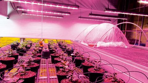 Le spectre lumineux AP67 (18 % de rouge lointain, pas d'ultraviolet) de Valoya favorise « la floraison et la croissance de la biomasse », et « convient aux fleurs et légumes à fleurs. Il permet aux abeilles pollinisatrices de travailler même en l'absence du soleil contrairement à beaucoup d'autres lumières artificielles » (source : Valoya). L'environnement de travail est rosâtre. PHOTO : STEPP BRETAGNE