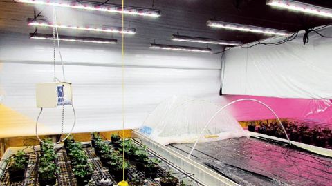 L'éclairage Led Valoya NS1 (spectre comportant de la lumière blanche et bleue), favorisant la ramification, « semble donner des boutures plus compactes » d'après les premiers résultats de la Stepp. PHOTO : VALÉRIE VIDRIL
